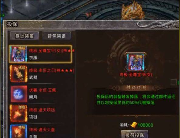 这个系统就是装备投保,这个系统是在开服第45天才会开启,咱们需要进入第四大陆,在地图的左下角就可以知道NPC,进入以后就可以看到每件装备的投保价格了,根据自己比较在意的部位进行投保,咱们就可以放心的去PK了。