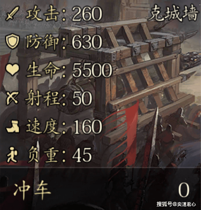 冲车(攻260、防630、命5500、射50、速160、负45)
