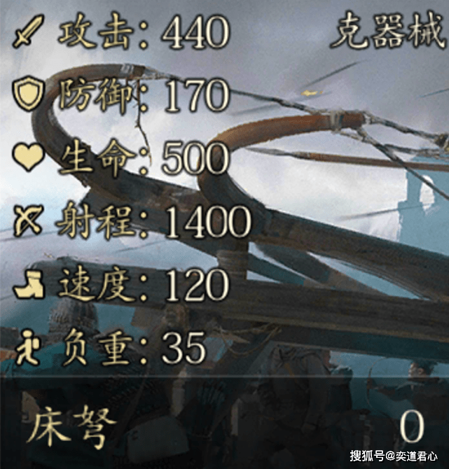 床弩(攻440、防170、命500、射1400、速120、负35)
