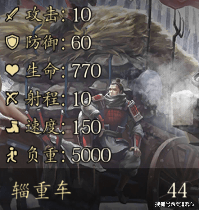 辎重车(攻10、防60、命770、射10、速150、负5000)