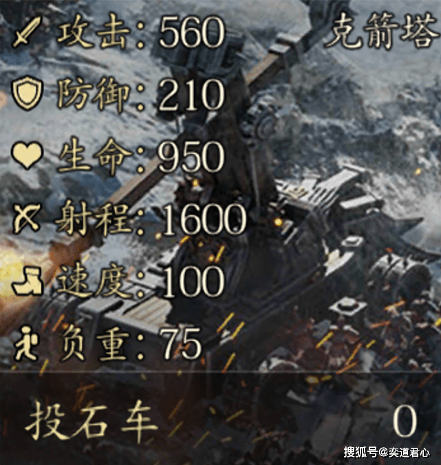 投石车(攻560、防210、命950、射1600、速100、负75)