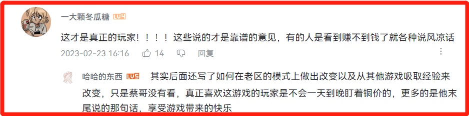 当然了。除了这些明摆着因为利益而黑老兵服的人之外。也有一些玩家意识到。其实并非是普通玩家在黑。更多是因为一些小节奏被放大了,导致完全不玩游戏的人也在冷嘲热讽。实际上大多数玩家在老兵服都不太关心铜币的价格。因为打装备卖装备赚钱才是常态,铜币本身产出足够,大多数时候不需要额外充钱去买别人手里的。