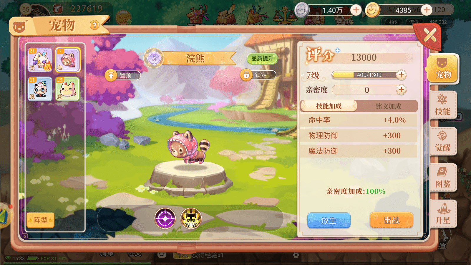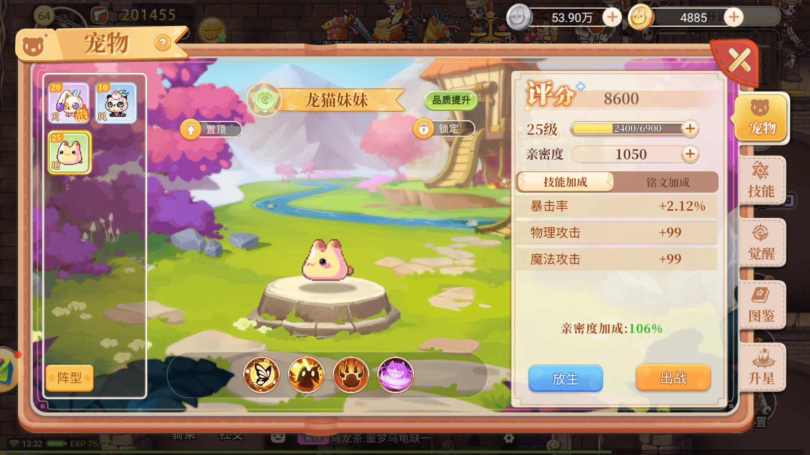 前期系统会送我们一只C级的龙猫妹妹,加双攻和暴击率,可以学习三个技能,在前期还是不错的宠物。