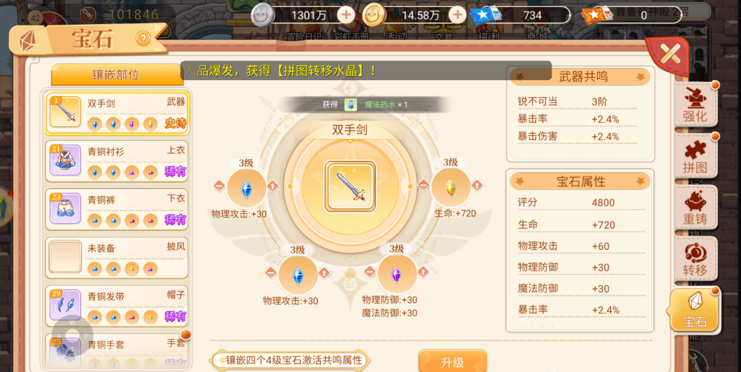 金币的获取:在线奖励,怪物手册,首冲活动;每日礼包,日常玩法,点券兑换;镶嵌系统达到装备格子的镶嵌要求会有附加的属性;共鸣等级越高则加持越多;推荐首选升级共鸣属性提高双攻和暴击爆伤的。