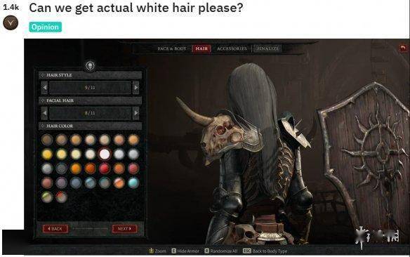 《暗黑破坏神4》的公开测试正在进行中,有玩家反映在捏脸界面明明选的是白色头发,结果实际显示的颜色为灰色,且大多数选择的颜色与实际显示效果不符。