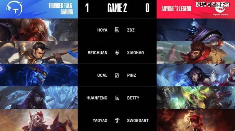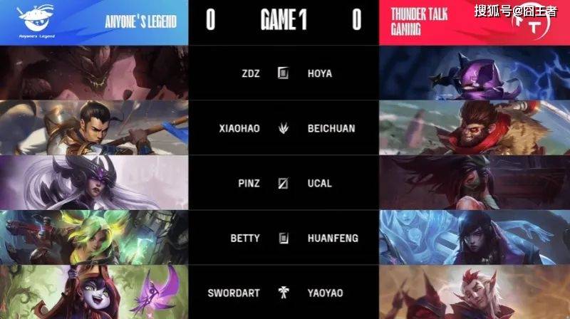 第一局比赛,AL蓝色方,禁用崔丝塔娜、瑟庄妮、霞、奎桑提、塞拉斯,选用石头人、赵信、辛德拉、泽丽、璐璐;TT红色方,禁用乐芙兰、盲僧、楚雨荨、雷克顿、贾克斯,选用凯南、孙悟空、阿卡丽、厄斐琉斯、洛。