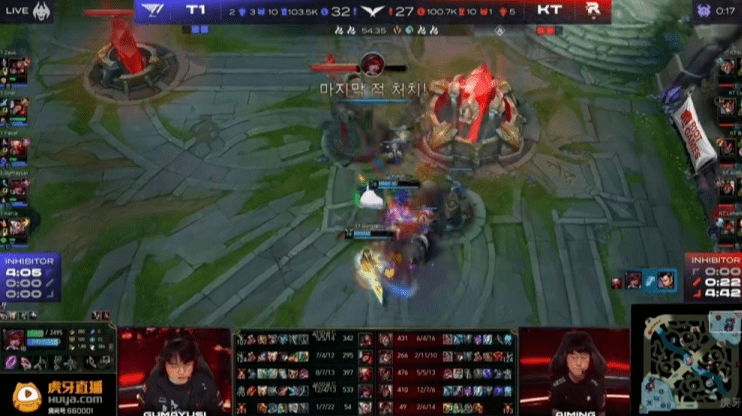 而有意思的是,在T1拿下最后一波团战胜利之后, KT的上单Kiin选择了偷家。但可惜的是,T1的上辅成功回城防守,而T1的双C则是一波拆掉了KT的基地水晶。