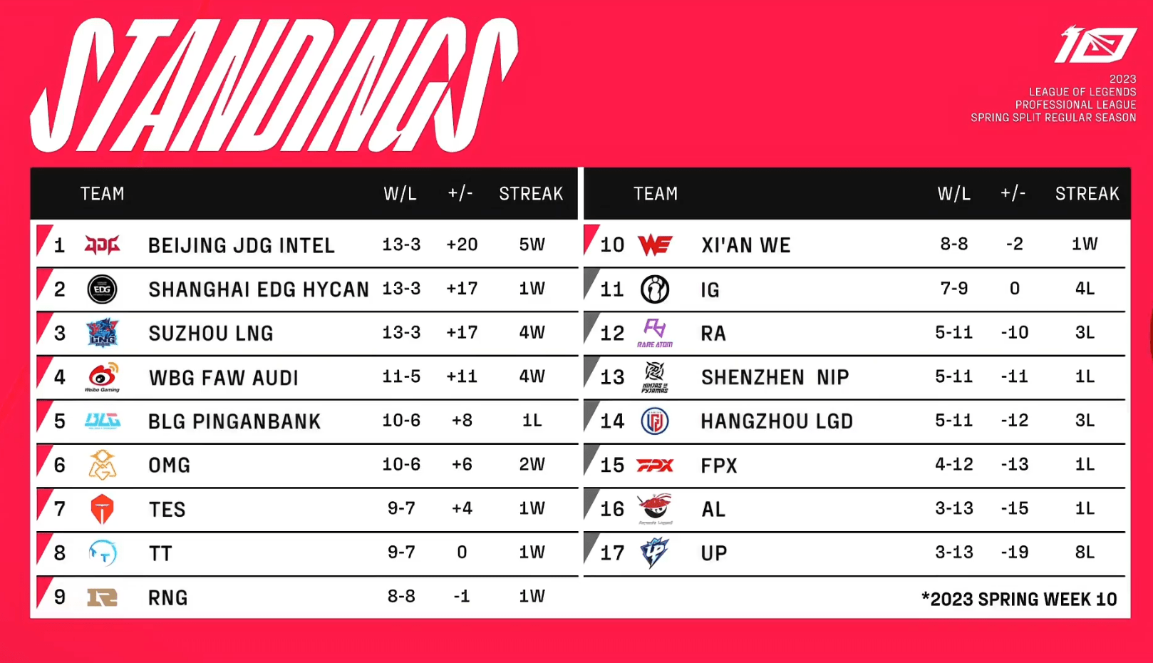 伴随着WBG成功以2-1击败RA,2023LPL春季赛常规赛的最终排名已经确定,而前十名进入季后赛的队伍分别是JDG、EDG、LNG、WBG、BLG、OMG、TES、TT、RNG以及WE。