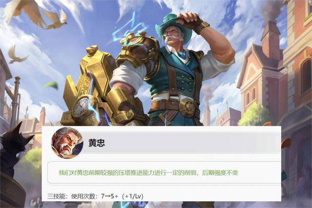 《王者荣耀》正式服这次进行版本更新之后,策划对黄忠的强度进行了调整,策划表示黄忠这位英雄的压塔能力过于突出,特别是中后期发育起来,基本没有英雄可以承受他的爆炸伤害。于是策划这次便决定针对这位英雄的大招效果进行削弱,不过这次主要是针对黄忠前期大招的炮弹数量进行抑制,从原来的七枚炮弹缩减为五枚。不过炮弹数量会随着等级的提升而增长,也就是说后期黄忠的大招依旧会拥有七枚炮弹。这次调整主要是抑制黄忠前期的压塔能力。