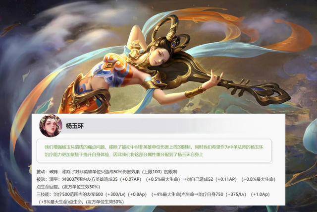 《王者荣耀》正式服这次进行版本更新之后,策划针对杨玉环的强度进行了调整,策划这次主要针对杨玉环清理兵线能力进行了提升,移除了她被动效果对非英雄单位造成伤害的上限效果。换句话来说就是杨玉环今后对兵线的伤害会被大幅度提升,这样一来就完美地解决了这位英雄的痛点,清理完兵线可以更快地支援其他各分路。同时这次调整杨玉环被动以及大招效果赋予自身生命恢复效果都进一步提升,不过所分担给己方英雄的治疗效果却被策划大幅削弱。