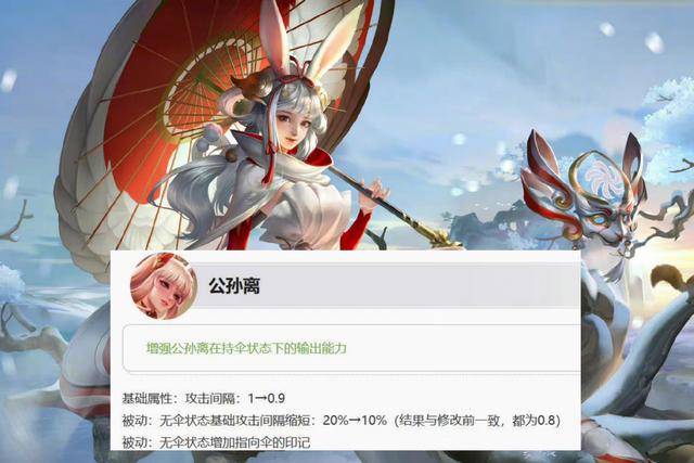 《王者荣耀》正式服这次进行版本更新之后,策划针对公孙离的强度进行了调整,公孙离这位英雄其实一直都未曾受到策划关注,算是王者峡谷中极少数长时间强度没有太大调整的英雄之一。而相信许多玩家都注意到了,公孙离这位英雄即将会推出一款荣耀典藏新皮肤,这款皮肤目前已经基本制作完成。为了能够更好地推出这款高品质新皮肤,策划决定借助这次版本更新,对公孙离的攻速进行了提升,无论是无伞还是有伞状态,公孙离的攻击间隔都进行缩短。