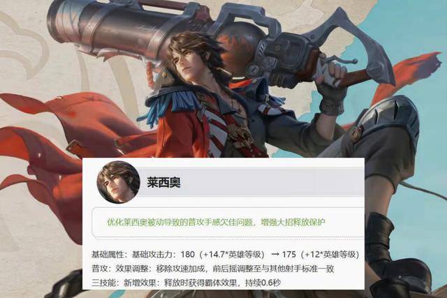 《王者荣耀》正式服这次版本更新之后,策划针对莱西奥的强度进行了调整,这次调整主要在于优化他普通攻击时的手感,同时增强了大招保护机制,用来解决莱西奥大招升空被击杀的痛点。莱西奥这次调整之后,普通攻击伤害略微下调,同时移除了其被动攻速加成效果,改为与其他射手前后摇一致。莱西奥的大招新增霸体效果,可以较好地将大招伤害打满。另外这次策划还对暗信进行了削弱,针对其一技能增加移速效果进行了抑制,方便其他玩家能够克制。