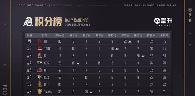 本日DT开局不利,一度被Tyloo反超积分,但好在沙漠图稳住了局面,凭借倒数第二局的吃鸡再度占据榜首位置,最后一局虽然在圈边3打2强攻Tyloo未果,被收下分数,但好在后续圈型刷走Tyloo也难有作为,最终以1分的优势堪堪守住榜首位置。