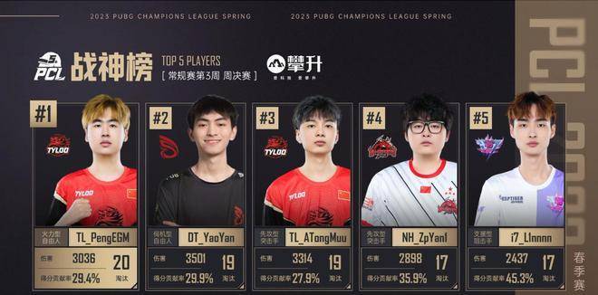 本周周决战神榜上Tyloo的Peng和Atongmu分别以20杀和19杀分居战神榜1、3位,被寄予厚望的枪男Shen拿到16杀没能上榜,不过本赛季Shen已经在Tyloo证明了自己的实力,反而是Peng和Atongmu打出出色的状态更加深了大家对于这支Tyloo的期待,毕竟Jiaoyang作为指挥的实力已经无需质疑。