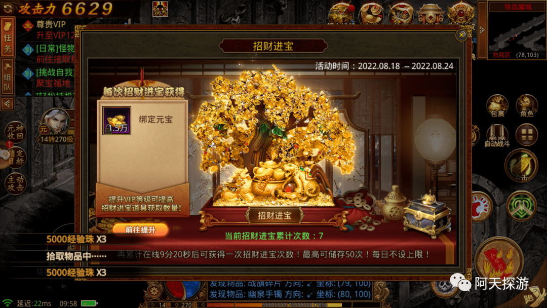 接着不用费事就能获得的奖励有开服活动的摇钱树,根据vip等级限时产出元宝和通宝等奖励,开服活动内还有首爆装备给元宝的奖励,其他的行会争霸的一般不是大佬就看看就行,也可以跟个好的行会混个参与奖。