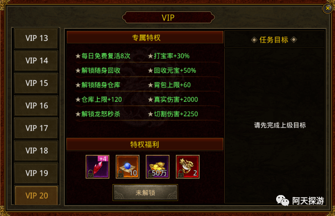 首先,进游后选择完元神后会有主线任务的出现,伴随主线的就是VIP系统,vip1-20级都是可以通过做主线任务来解锁的,相应的会获得很多特权和奖励。
