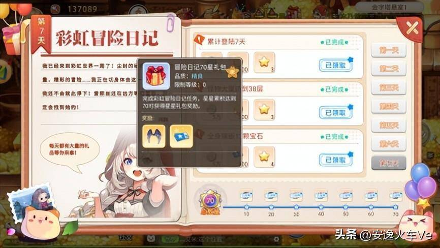 喽,小伙伴们,大家好啊,本期给大家讲解一下这个彩虹岛手游里一些你容易忽视的细节啊,最近几天大家是不是看到有很多的玩家都有了一双帅气的翅膀,它的名字叫星辉夜翼,有的小伙伴说在商城里没有找到,那是因为这个翅膀并不是买的啊,这里我就要吐槽一下了,商城里那些翅膀我觉得是没有这个翅膀好看的,在游戏界面上方有一个冒险日记,点击之后之后完成里面所有的任务就可以获得了。