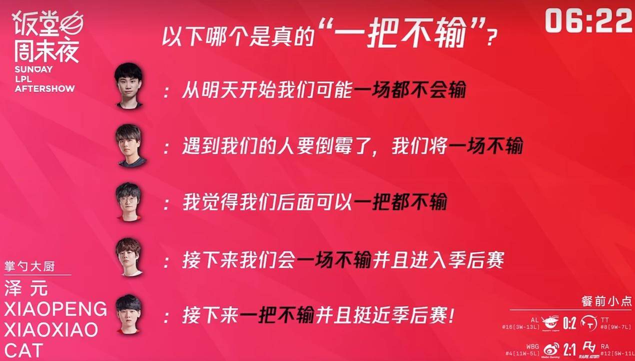 LPL春季赛常规赛阶段的比赛在昨天全部结束了,结束之后还安排了一期饭堂节目,请到了管泽元,Cat,笑笑还有小鹏(两位TES名宿),开始火力全开。
