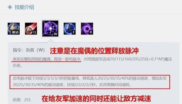 W技能:以魔法傀儡为中心释放脉冲,对周围敌人造成伤害,留下持续3秒的能量场,降低敌人的移动速度,增加友方军队的移动速度。