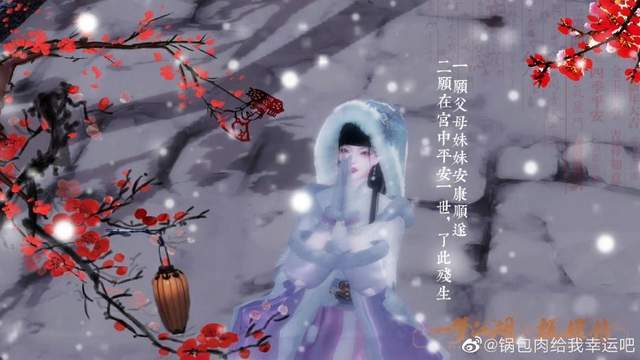 大家应该还记得剧中故事多发的倚梅园吧?江湖中的倚梅园也是人气极高,吸引了不少姐妹来此游玩。红梅和白雪交相辉映,分外旖旎多情~在银装素裹的雪景中,佳人虔诚跪在梅树下祈愿,白毛镶边的斗篷衬托出佳人姣好的容颜,尽显少女的天真烂漫~咱就是说,少侠 @锅包肉给我幸运吧 的少女甄嬛刻画得也太还原了吧!