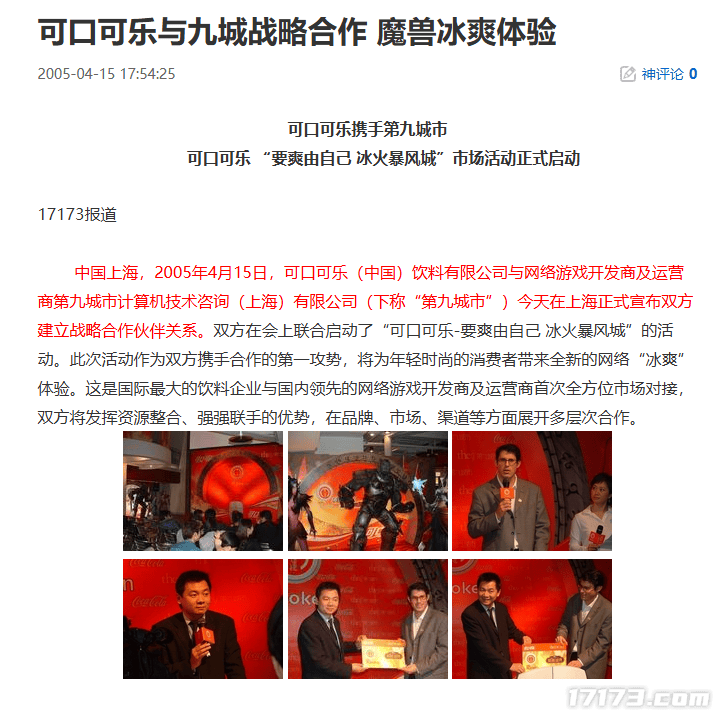 2005年4月15日,九城和可口可乐正式宣布双方建立战略合作伙伴关系,启动了“可口可乐-要爽由自己,冰火暴风城”的活动。