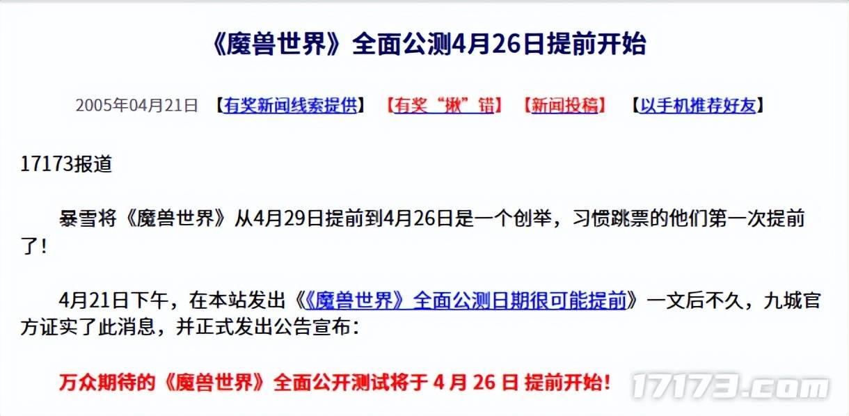 2005年4月26日凌晨2点30分,《魔兽世界》公开测试正式开始,玩家们终于可以不用CD-Key就进入游戏了。在此之前官方宣布的日期是4月29日,《魔兽世界》公测比预期中提前了3天。