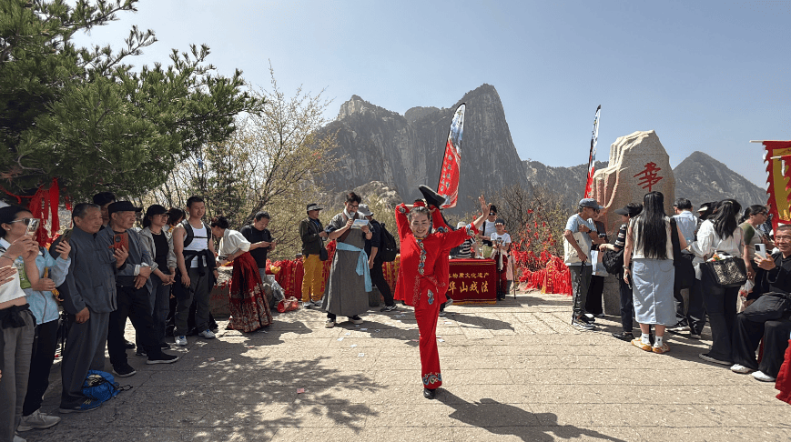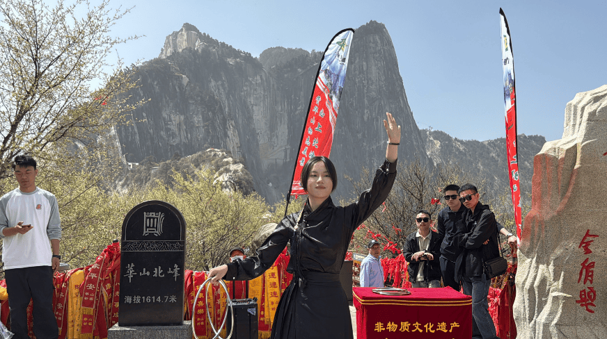 4月17日,参加“山河胜景魅力非遗——华山论技”非遗进景区活动的雷霖、张秀芳等四位非遗传承人和武林高手在华山北峰“论剑”,为八方游客带来了精彩的演出。