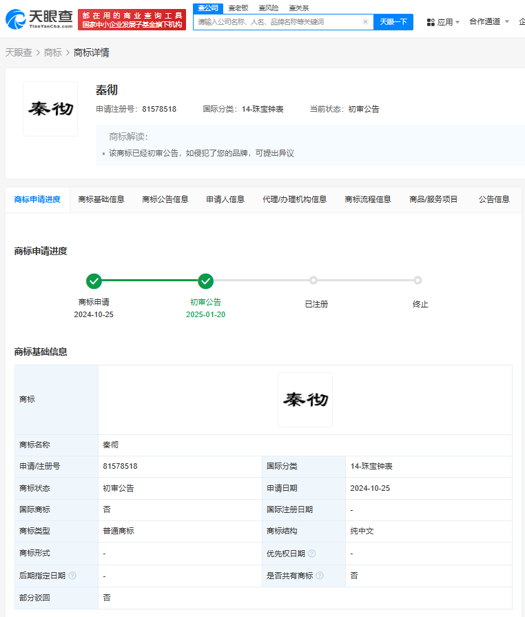 然而,秦彻的影响力远不止于此。天眼查数据进一步揭示,咸阳市某食品经营部和个体经营者史某某也尝试申请注册“秦彻”商标。其中,咸阳市某食品经营部在方便食品类别上的申请已成功获得注册,而史某某在珠宝钟表类上的申请则已发布初审公告。这些动态无疑反映了“秦彻”这一品牌名称在不同行业领域的广泛需求和潜力。