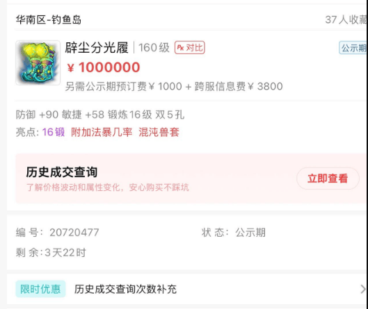 四月大改来临前夕,有名商人瞅准市场,花费11.1W块买下这双16锻黑宝石的野兽法暴几率鞋子。因为大改内容新增了8个法术类的特技,还提供了特技转换功能,所以这类装备可摇身一变服战孤品级硬件,商人也是趁机将这双鞋子以百万价格上架到藏宝阁。