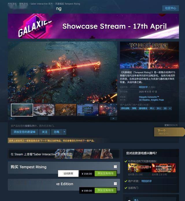 《幽灵行者》、《GRAVEN》开发商Slipgate Ironworks打造的RTS游戏《风暴崛起》于本月17日开启了“抢先体验”,Steam国区159元,豪华版199元。