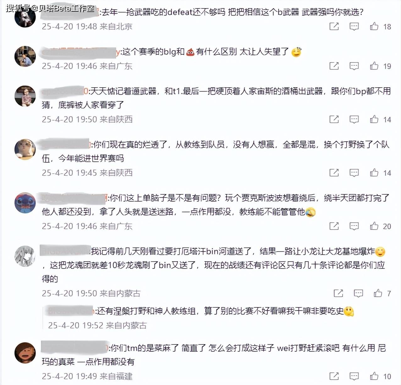 赛后BLG官博炸了,有粉丝怒斥教练:去年一抢贾克斯已经失败很多次了,为什么到现在还在相信贾克斯?BP的底裤已经被看穿了!也有粉丝怒斥打野wei:换了个打野就像是换了一支队伍一样,wei整场比赛毫无作用!更有粉丝批评上单Bin:天天惦记着贾克斯,打团只想着绕后,拿到人头就送就迷路,一点作用也没有。