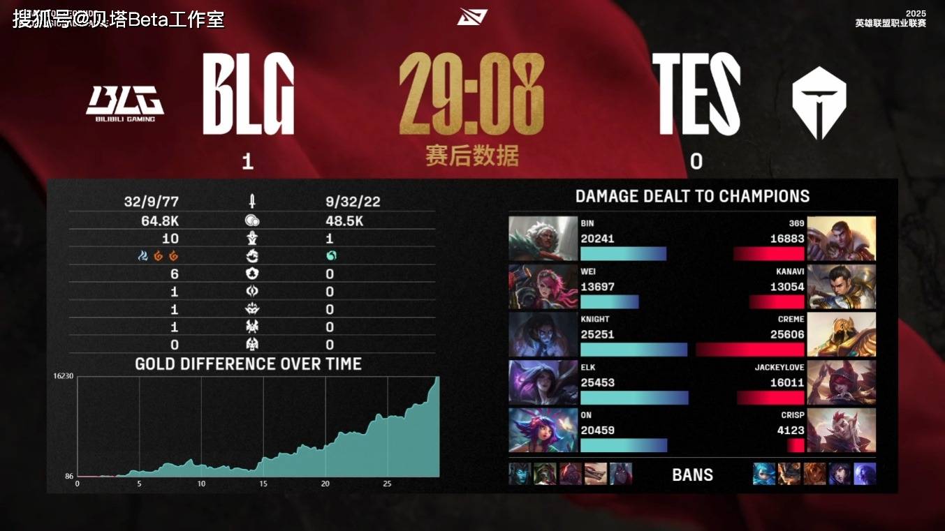 简单回顾一下这场BO3,第一局BLG上单安蓓萨,打野蔚,中单塞拉斯,下路卡莎加妮蔻;TES上单杰斯,打野赵信,中单沙皇,下路洛与霞。对线期BLG推掉了中路一血塔,并且在小龙团获胜,Knight塞拉斯豪取3杀,前期BLG经济领先3K。