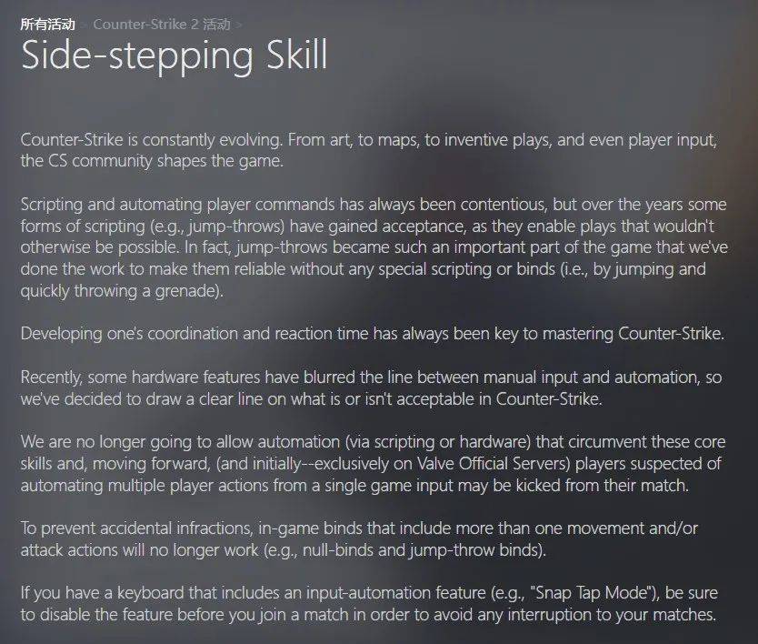 而前面提到雷蛇在自家键盘中使用的Snap Tap技术,说白了也就是后覆盖。 这能让玩家在CS2等需要“急停”操作的游戏中实现更精确的反向移动,消除人手的误操作可能性——在V社眼中,这无疑就相当于一种宏/内置脚本。