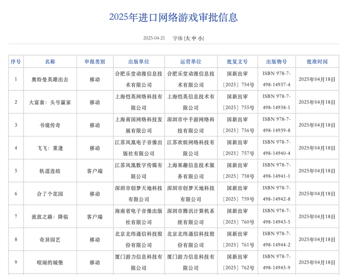 4月21日,国家新闻出版署更新2025年进口网络游戏审批信息,4月份新增9款游戏获批。
