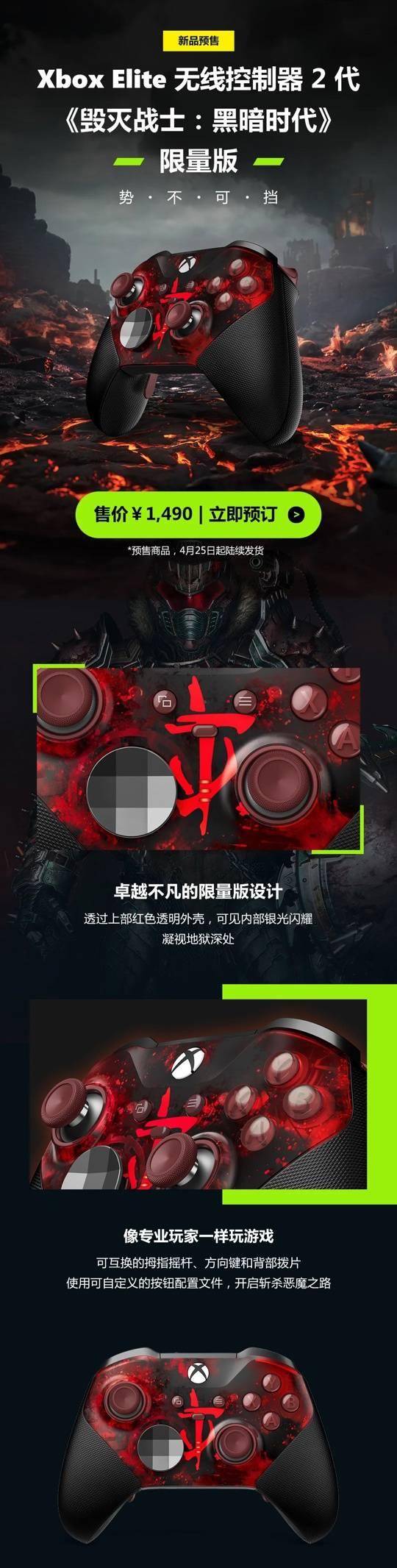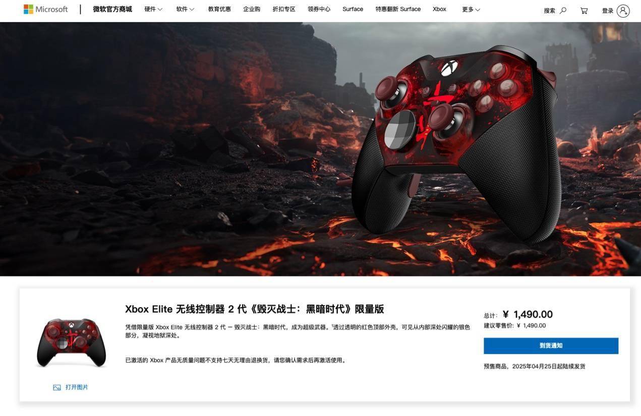 IT之家 4 月 22 日消息,微软官方今日发文,宣布 Xbox《毁灭战士:黑暗时代》联名精英手柄 2 代开启预售,售价 1490 元。