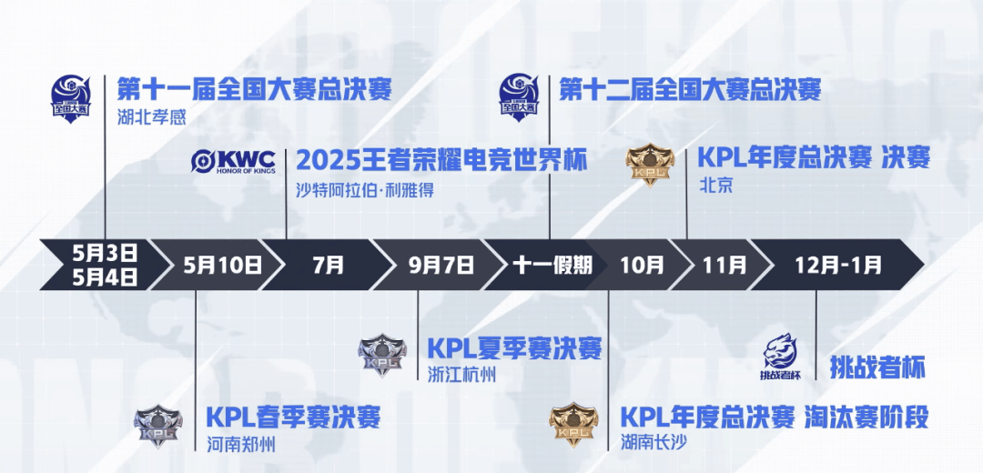 最后是岁末的年度总决赛与挑战者杯,前者淘汰赛阶段将落地长沙七彩盒子,总决赛将落地北京鸟巢,后者目前已知将在2025年12月至2026年1月举行,具体的办赛城市还需等待进一步官宣。