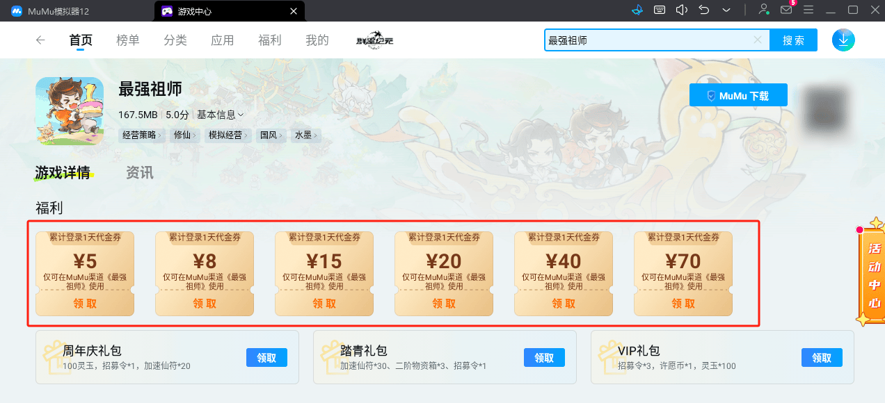 另外MuMu还为最强祖师的玩家们准备了专属资源,让大家开局拿满躺平,来看看具体的领取方法吧。