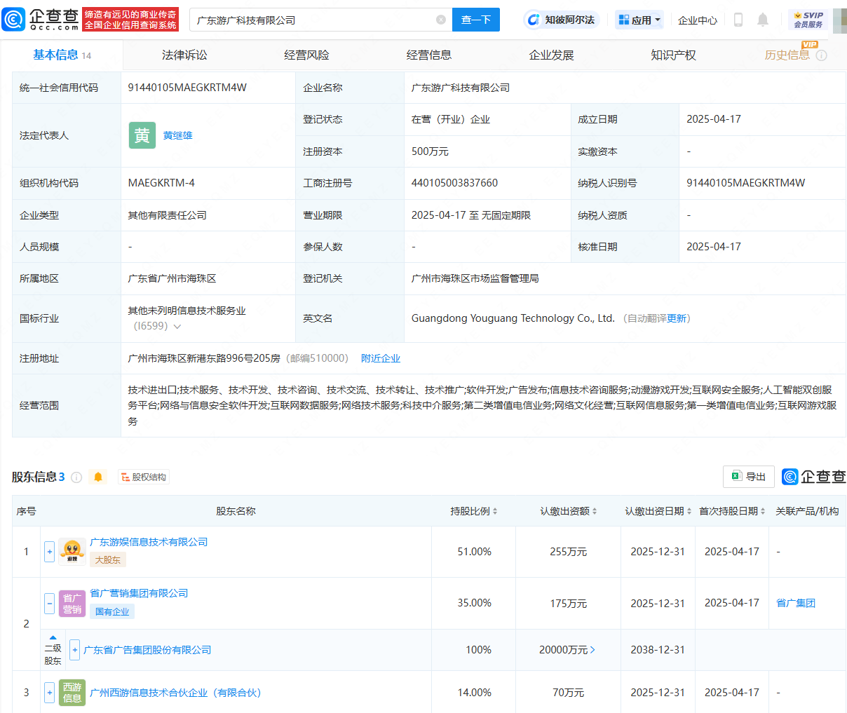 企查查APP显示,近日,广东游广科技有限公司成立,法定代表人为黄继雄,注册资本为500万元,经营范围包含:技术进出口;广告发布;动漫游戏开发;互联网安全服务;人工智能双创服务平台;互联网数据服务;网络文化经营等。企查查股权穿透显示,该公司由广东游娱信息技术有限公司、省广集团(002400)旗下省广营销集团有限公司等共同持股。