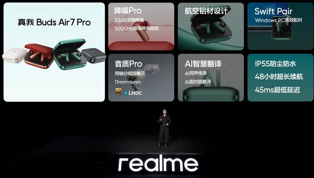 此次发布会不仅带来手机产品,还有Buds Air7 Pro,其采用全金属航空铝设计,支持53dB深海降噪,5000Hz最高降噪频宽、AI同声传译,实时对话翻译,支持32种外语翻译。还有48小时长续航,45ms超低延迟,IP55防尘防水,应对各种场景下的使用需求。