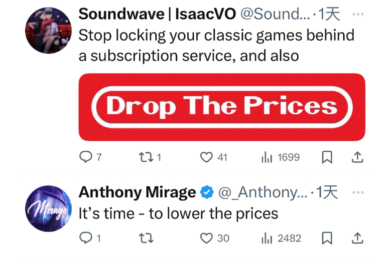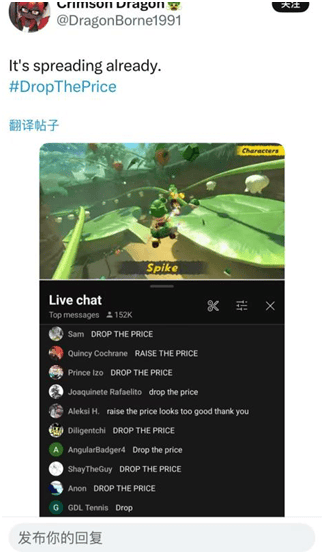 甚至任天堂欧洲、拉美、西班牙等区域的X账号评论区,也被玩家们的#droptheprice(降价)占领。