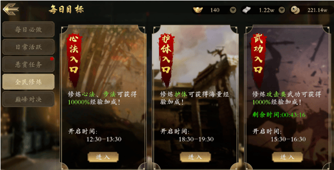 在《千年手游3D》中,不同种类的武学都有自己独特的成长路径和修炼办法,给玩家带来了好多游戏的挑战和乐趣。游戏里有修炼场,每天会定时开放三个不一样的修炼场次。像攻击类的武学,比如《无击阵》《狂风刀法》这些,玩家得经常参加战斗来积累熟练度,才能让武学的等级提高。比如说,在 15:30 到 16:30 开放的武功修炼场,玩家在这时候能得到 1000% 的修炼经验加成。