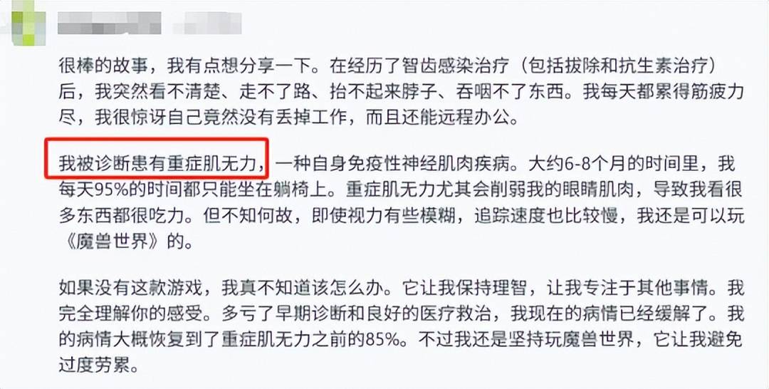 对此,大部分玩家都是一脸不信的样子,觉得是扯淡!但也有人分享了跟博主类似的经历,一位患有重度肌无力的玩家也是靠《魔兽世界》帮他保持理智熬过了那段痛苦的时光,最后也是将病情逐步治愈。
