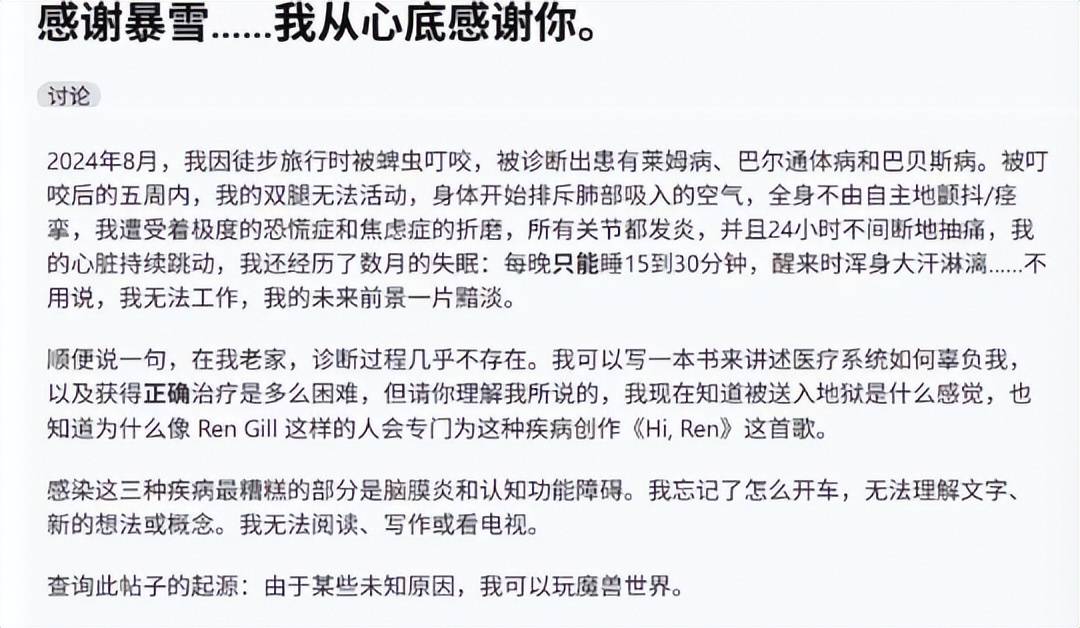 根据博主的分享,他在去年8月的时候因为徒步旅行被蜱虫叮咬,患上了莱姆病、巴尔通体病和巴贝斯病,遭受了身心的折磨。其中,最让博主难过的是,因为这三种疾病,又患上了脑膜炎和认知功能障碍,导致他无法理解文字并忘记了一些生活必备的技能。