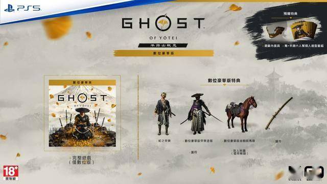 数字豪华版内含《羊蹄山之魂》数字版以及游戏内特典,包括蛇之甲冑,以及与初始甲冑不同的涂装。选购此版本还会获得独特的坐骑和马鞍配色,以及游戏内的护符、金色刀具和旅人地图的抢先解锁,协助玩家在这个世界中找到能升级技能的雕像。