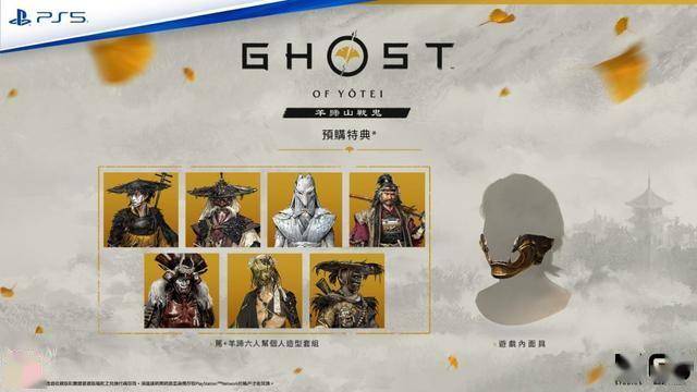 只要预购任何一个版本的《羊蹄山之魂》,即可在推出当日获得一款独家游戏内面具,以及一组七款的PSN个人造型,以笃与羊蹄六人帮的概念艺术为设计。
