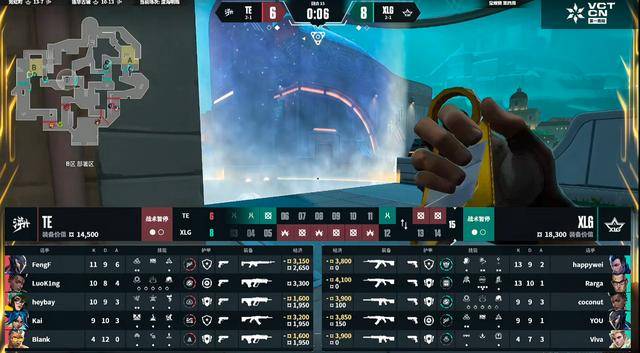 上半场TE赢下手枪局,XLG第2回合就打出翻盘并连拿四分。第6回合Biank在A点守住打赢残局拿到第二分。第8回合TE慢打B点想要打一波协同,但XLG中路与点内牢牢架住轻松守住。第10回合FengF钛狐开大清空B点的加强,heybay蝰蛇开大覆盖包点,Rarga与coconut两人回防,Rarga毒雾里打掉heybay赢下。上半场XLG 8-4 TE。