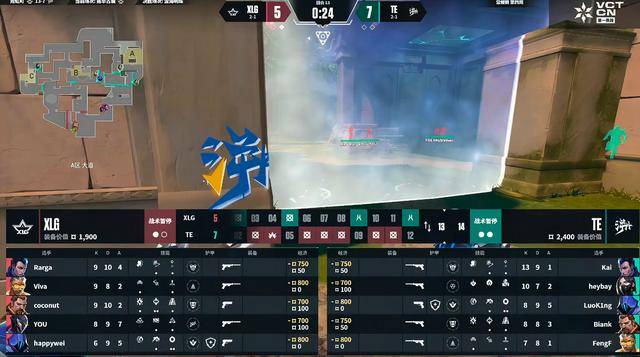 上半场XLG赢下手枪局,TE赢下奖励局连追两分,第4回合XLG佯攻B点真打A,但这波假打被TE迅速的回防给守住。TE连拿三分,XLG暂停调整起到效果,XLG打出一波六连胜,第9回合更是打出完美团灭。第12回合Kai一波三杀止住连败,上半场XLG 8-4 TE。