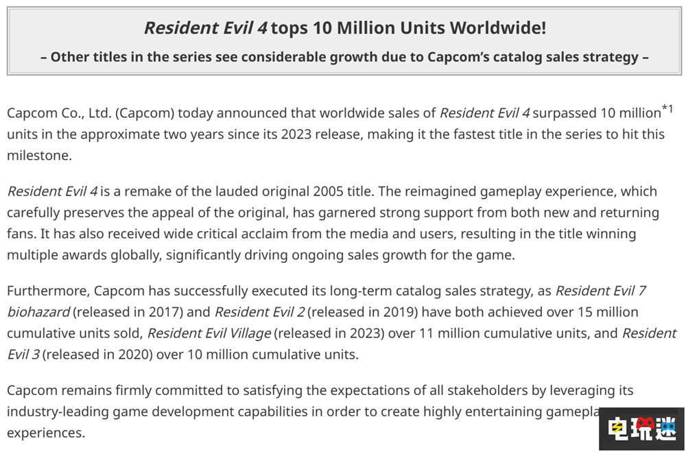 卡普空官方正式宣布《生化危机4:重制版》全球销量突破1000万份,其成为《生化危机》系列中销售速度最快的游戏。同时卡普空还更新了其他《生化危机》系列游戏销量。