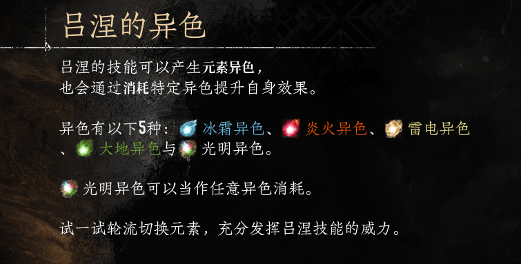 比如游戏中法师定位的吕涅,她的技能存在独特的“异色增幅”机制:释放技能会获得不同属性的元素异色: