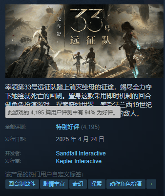 对我而言,昨天发售的《光与影:33号远征队》要属于后者,目前游戏在Steam的好评率为94%,评测网站Metacritic也给出了92分,属于“Must-Play”(必玩)的等级。